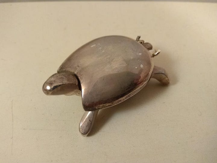 I have a hand-sized brass turtle hinged box similar to the silver one you show! It's from my parents, from the 70s, I think. Garage sales and vintage fairs are an awesome way to find tchotchkes for the home.