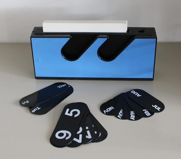Office desk, why so serious? Retro office objects from the 80s will brighten any work day. I recently found an orange perpetual calendar that I look forward to updating every day.