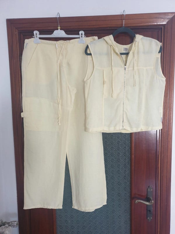 Some more: beige pant suit (M/L, 30€), light blue linen pant suit (XL, 65€), black pant suit (M, 120€), grey skirt suit (M, 54€), short sleeve & pants suit (L, 50€)