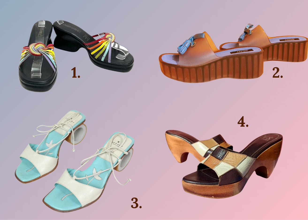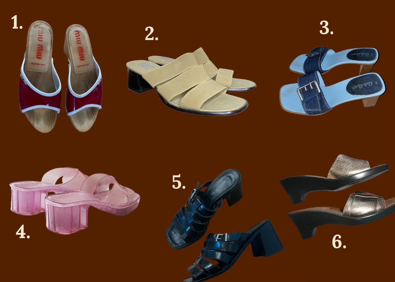 Designers weren’t afraid to play with material and colors, and it shows. Mules came in all shapes and form: denim, wooden, jelly, strappy.